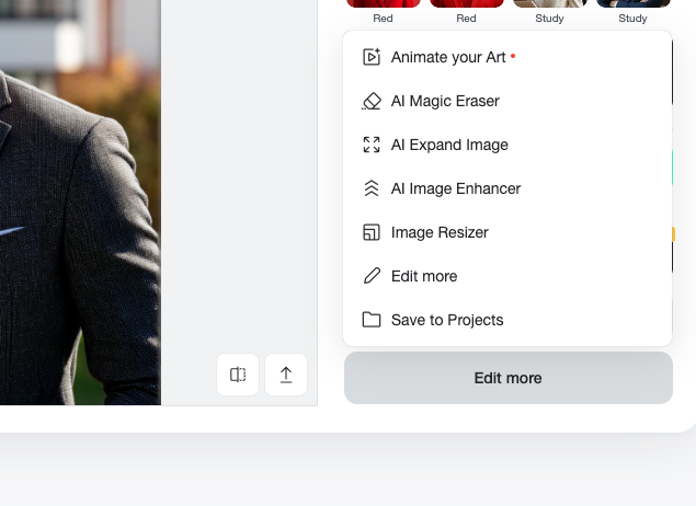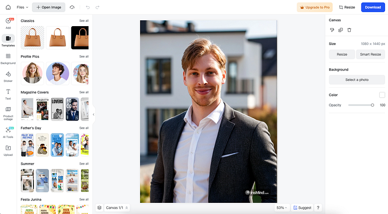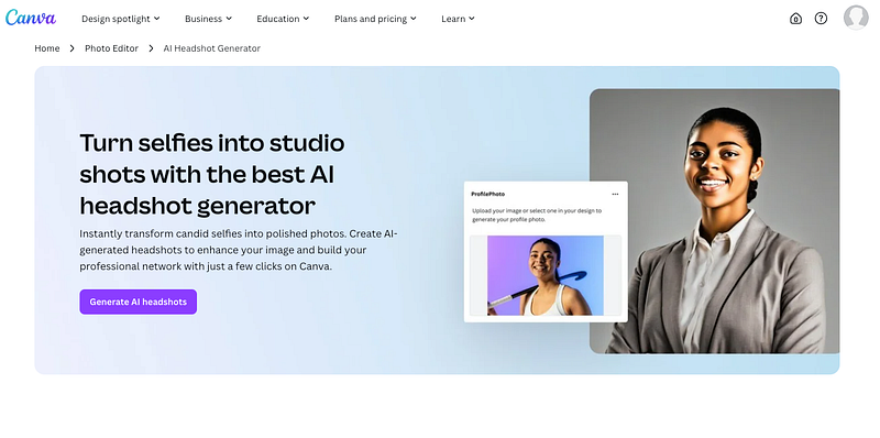 The editing view actually looks a lot like Canva — which makes me think this is more of an online design platform, and the AI headshot generator is just one feature within a bigger toolkit.