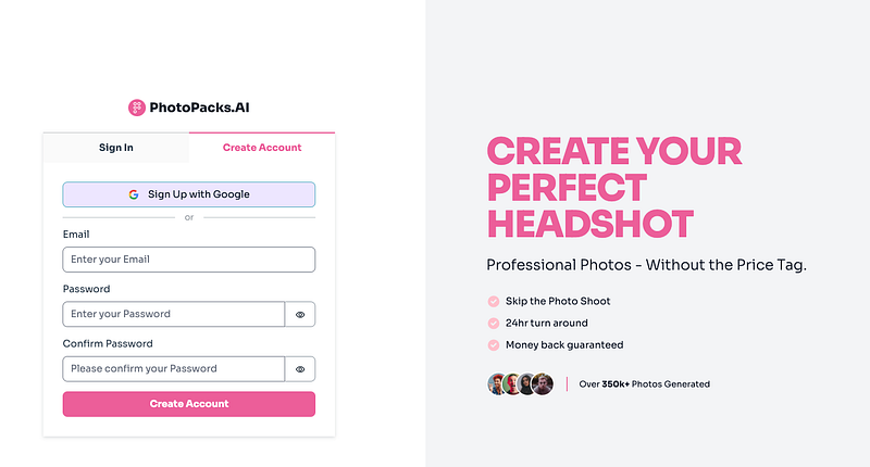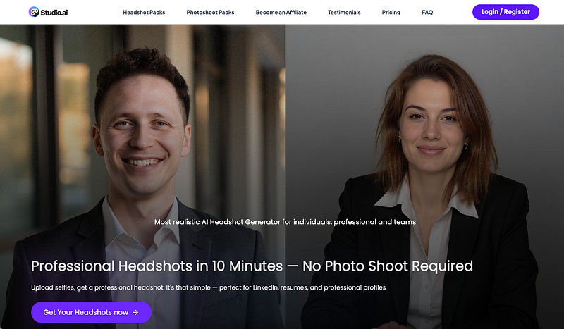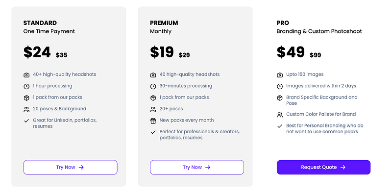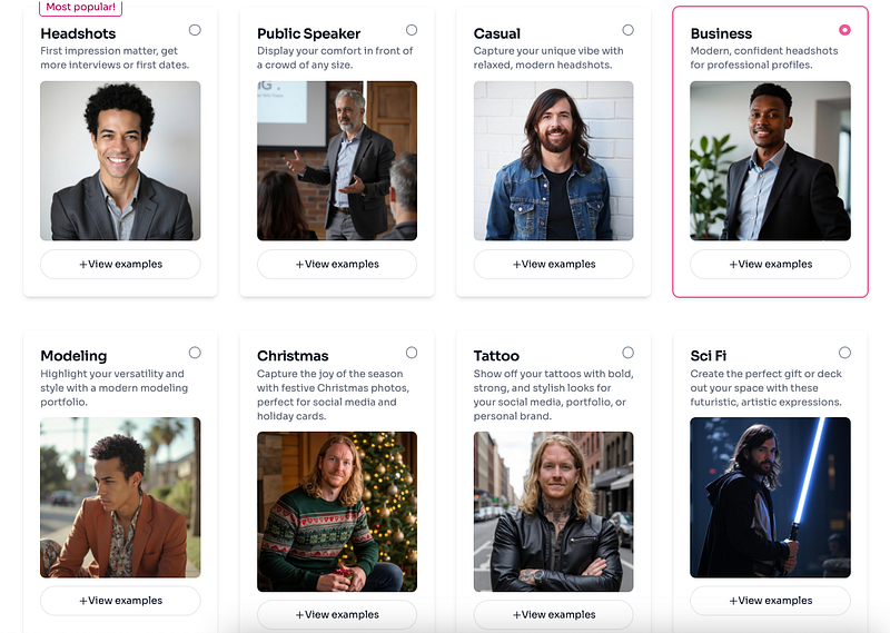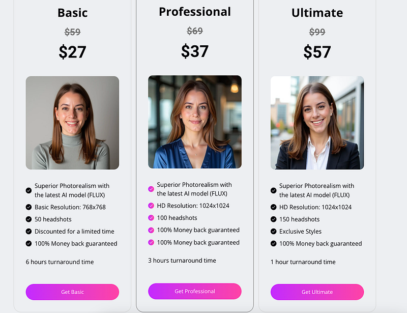 Please, have a look at these three different AI headshot generators and their landing pages.